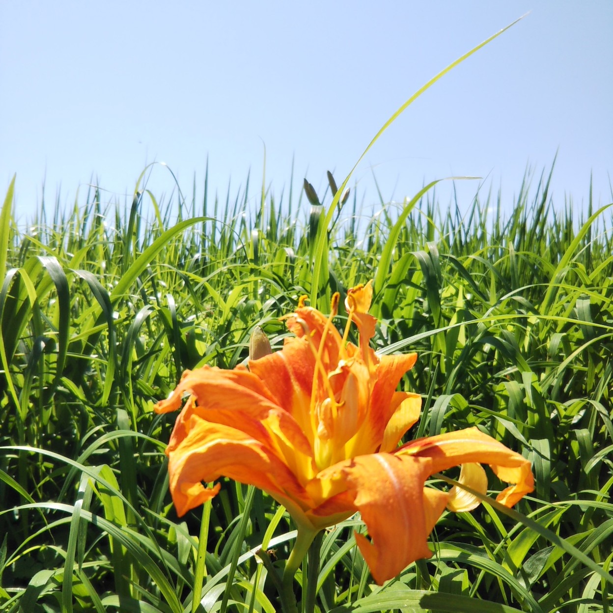 あぜには、夏に咲くヤブカンゾウが太陽に向かって輝いていました。