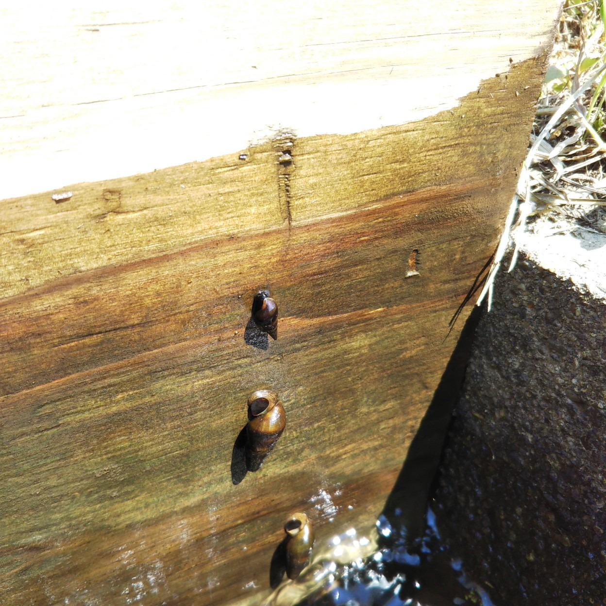 田んぼに水を入れたり止めたりする止水板にカワニナという細長い巻貝が三匹くっついていました。